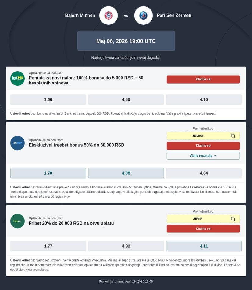 Bajern - PSŽ kvote kladionica bet365, 1XBET i Vivatbet su već dostupne, a biće ažurirane kako se meč bude približavao, tako da je koristan Bajern - PSŽ savet da pratite redovno sajtove vaših omiljenih kladionica, te da i u skladu sa promenama reagujete i time povećate svoje šanse za uspešno klađenje.